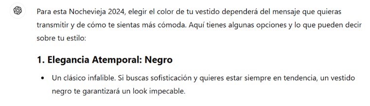 Buscamos por ejemplo inspiración para un vestido de fiesta para esta Nochevieja en Chat GPT, haciendo esta petición (PROMPT)